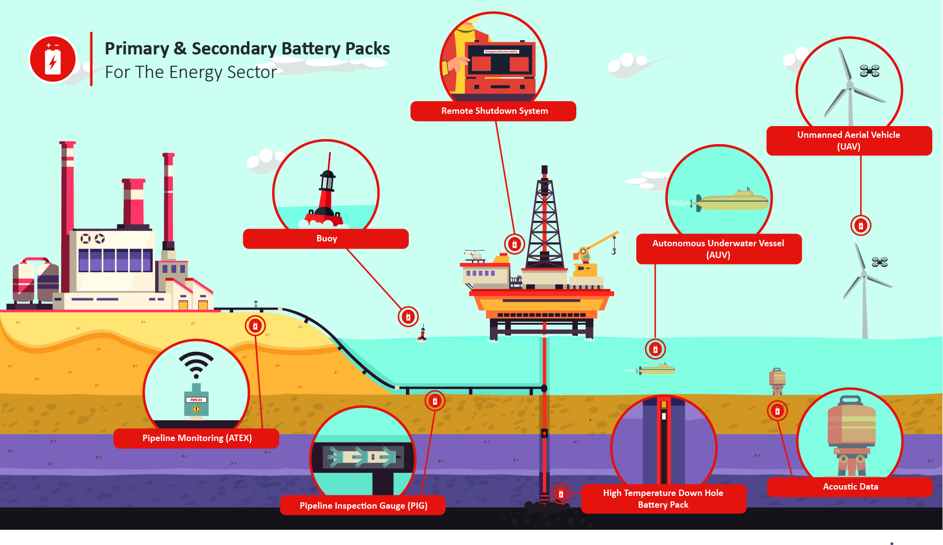 Pipeline Inspection Gauges (PIGs) place demanding requirements on battery power sources as they help ensure the safe and secure transfer of valuable petroleum resources. Our range of lithium cells and battery packs are used to power many of the critical data collection functions of the inspection gauge as it travels over long distances through the pipeline.